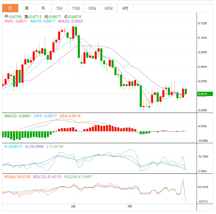 周三盘中,澳元兑美元下跌至0.6675,跌幅0.52%。