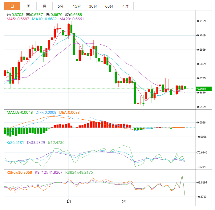 周五盘中,澳元兑美元下跌至0.6689,跌幅0.31%。