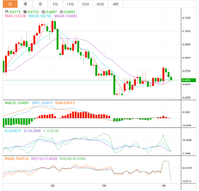 周四盘中,澳元兑美元下跌至0.6693,跌幅0.34%。