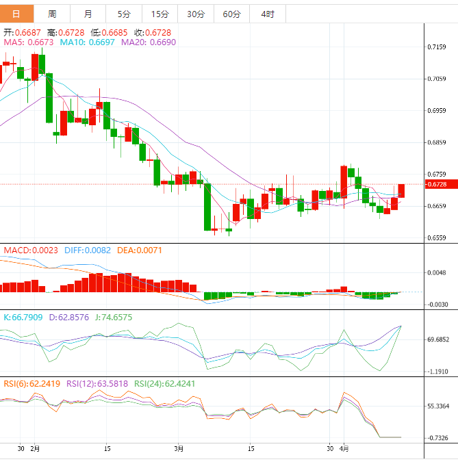 今天预期的交易区间在0.6640支撑位和0.6760阻力位之间。