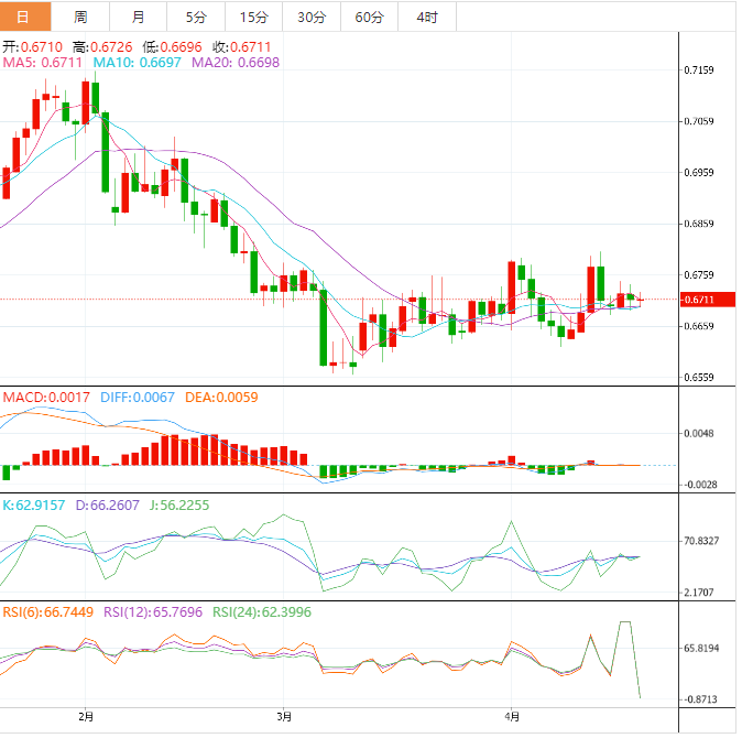 周四盘中,澳元兑美元上涨至0.6713,涨幅0.01%。