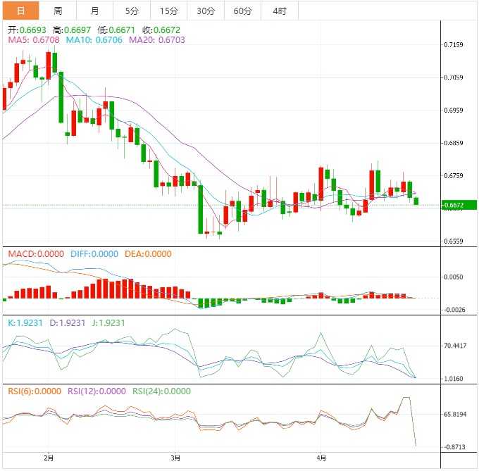 澳元兑美元周一连续第二天走低,并在亚洲交易时段跌至一周半低点0.6675附近。