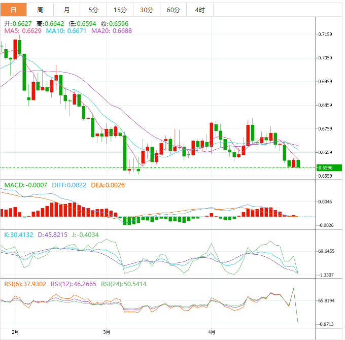 周五盘中,澳元兑美元下跌至0.6597,跌幅0.48%。