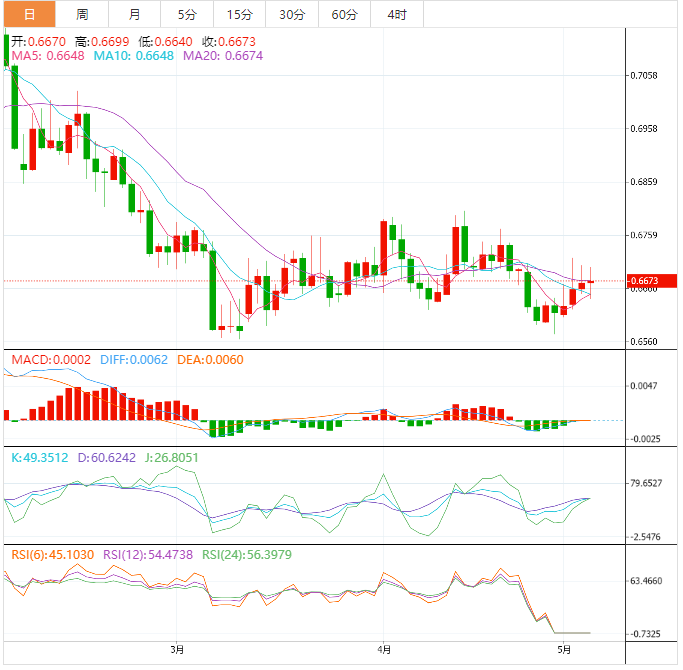周四盘中,澳元兑美元上涨至0.6675,涨幅0.06%。