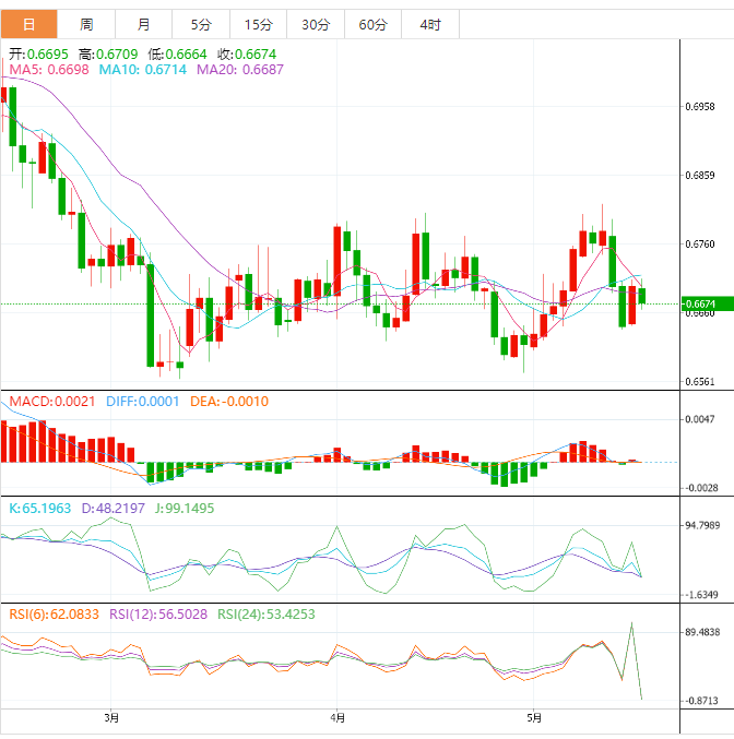 周二盘中,澳元兑美元下跌至0.6675,跌幅0.37%。