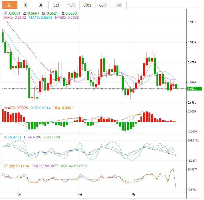周二盘中,澳元兑美元下跌至0.6631,跌幅0.32%。