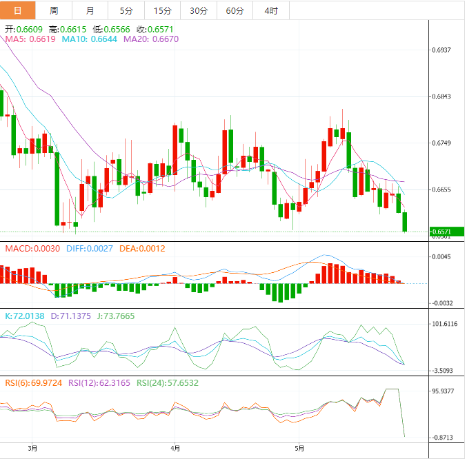 周三盘中,澳元兑美元下跌至0.6572,跌幅0.58%。