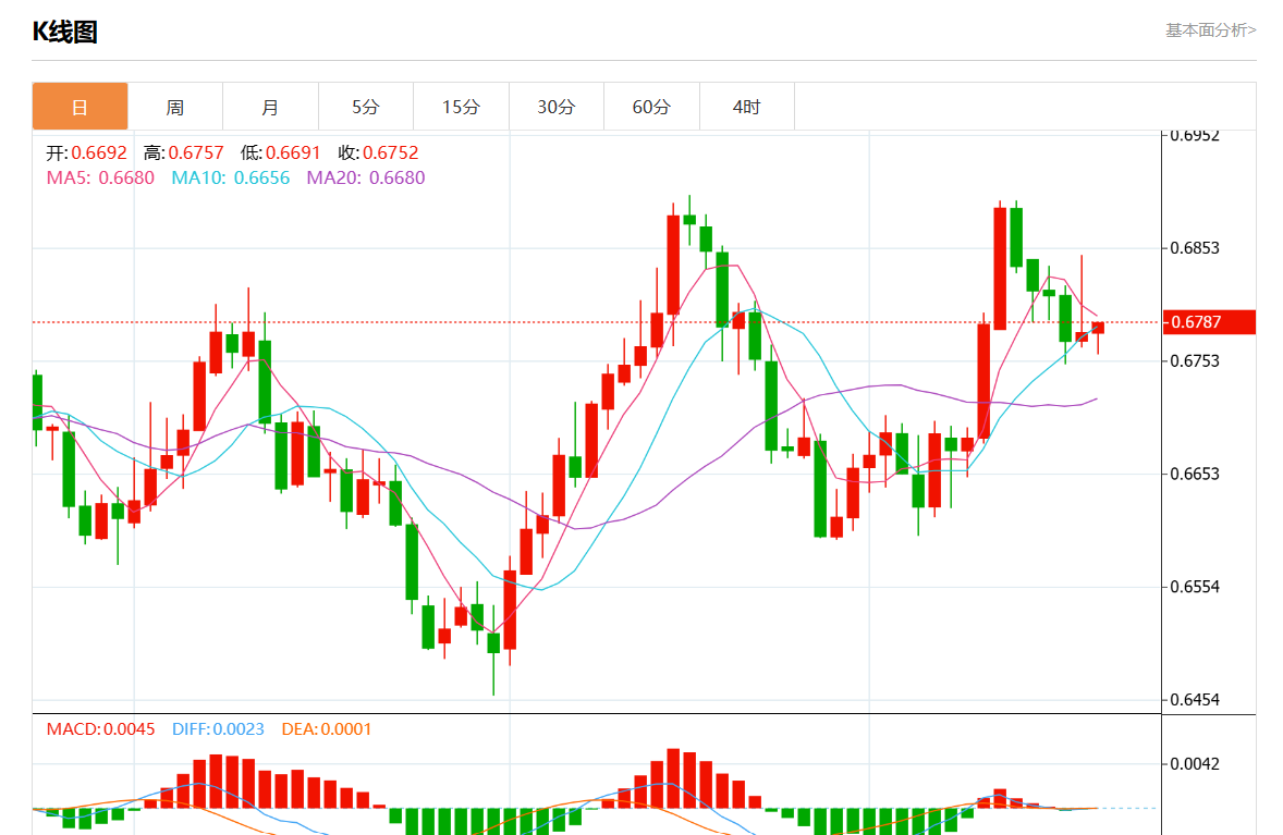 周五盘中,澳元/美元报0.6784,涨幅0.09%。