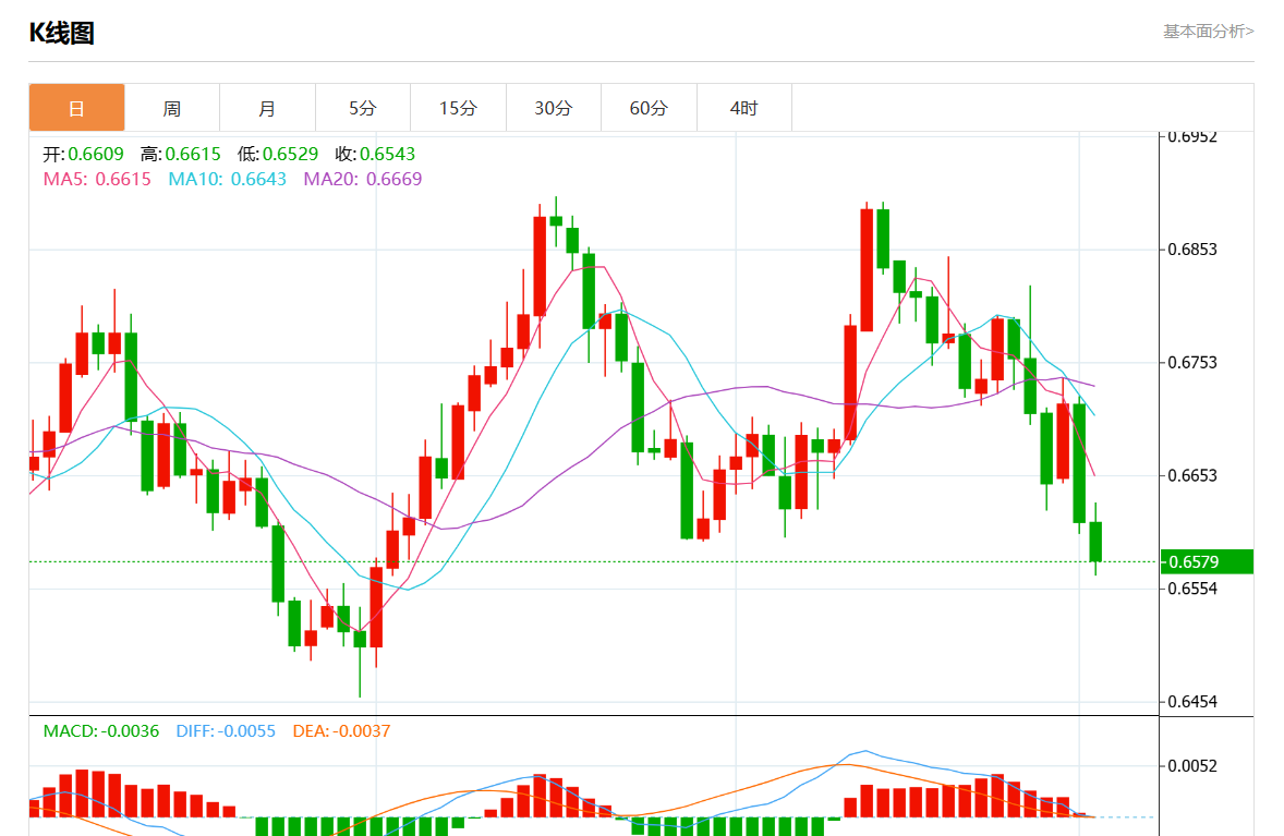 周三盘中,澳元/美元报0.6581,跌幅0.48%。