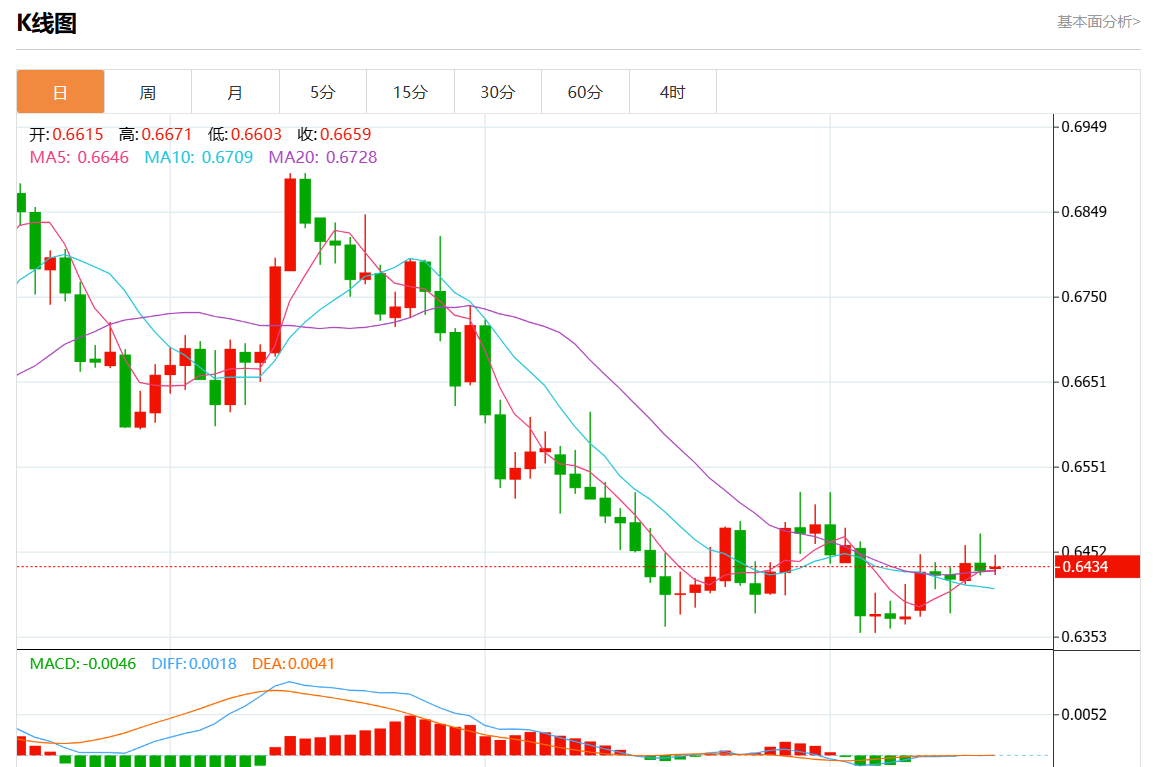 周一盘中,澳元/美元报0.6432,涨幅0.02%。