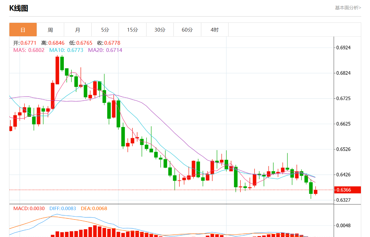 周四盘中,澳元/美元报0.6370,涨幅0.29%。