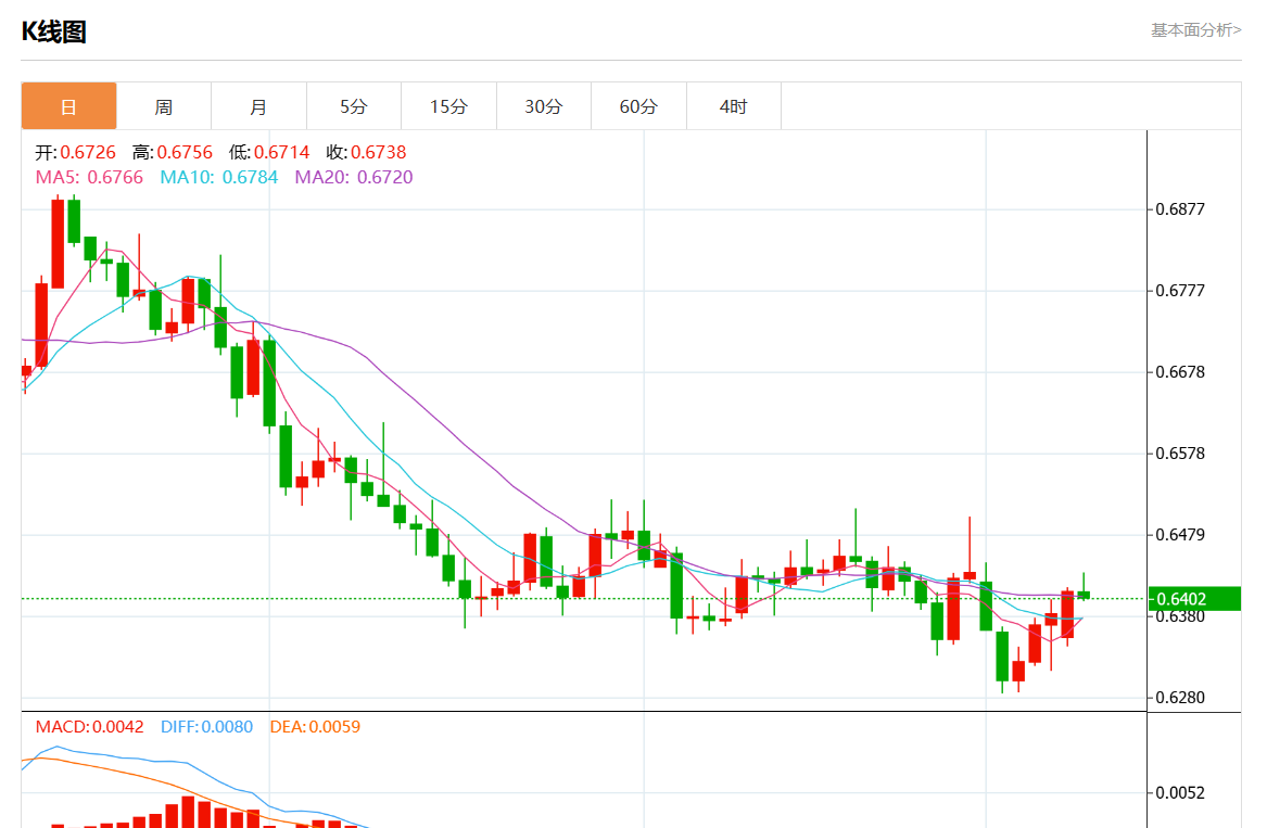 周二盘中,澳元/美元报0.6394,跌幅0.27%。