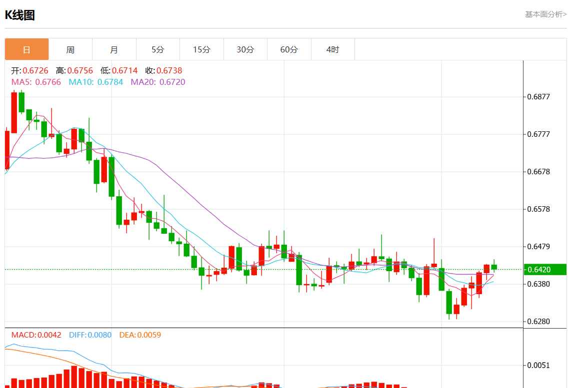 周三盘中,澳元/美元报0.6426,跌幅0.08%。