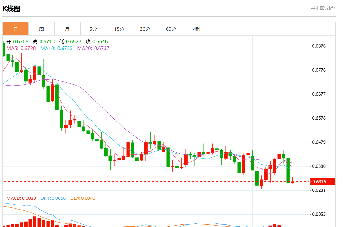 周五盘中,澳元/美元报0.6322,涨幅0.14%。