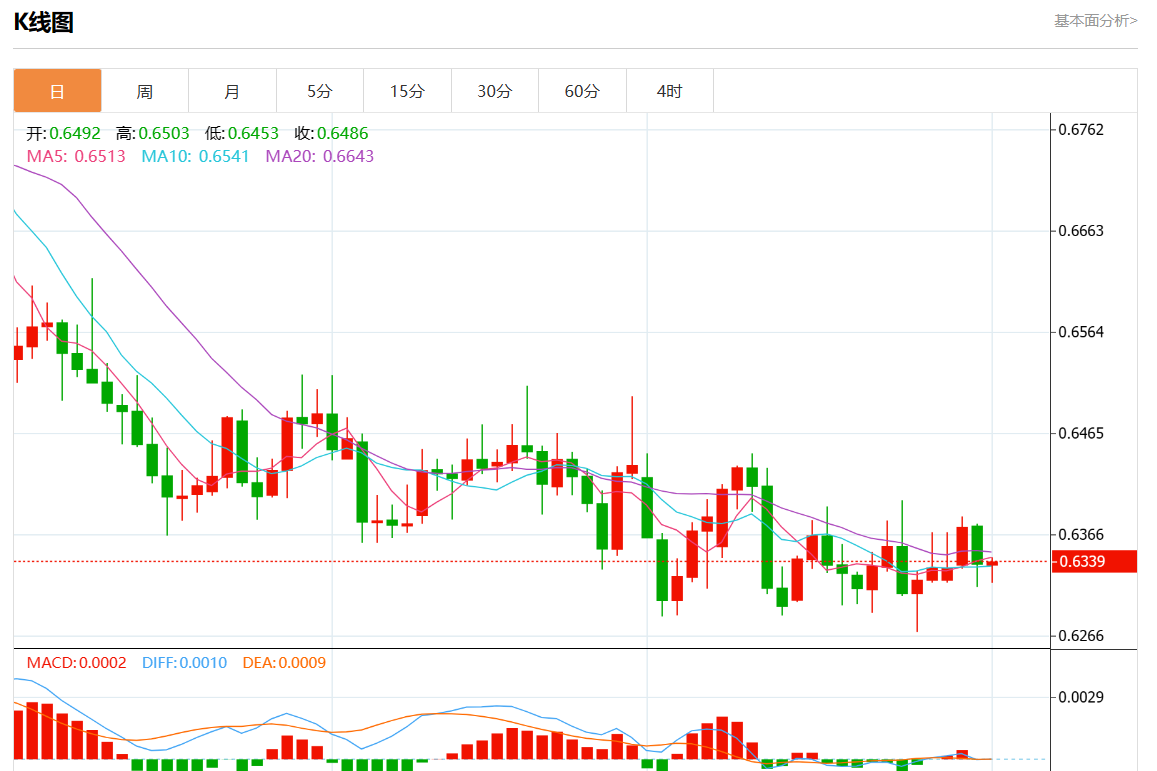 周三盘中,澳元/美元报0.6340,涨幅0.05%。