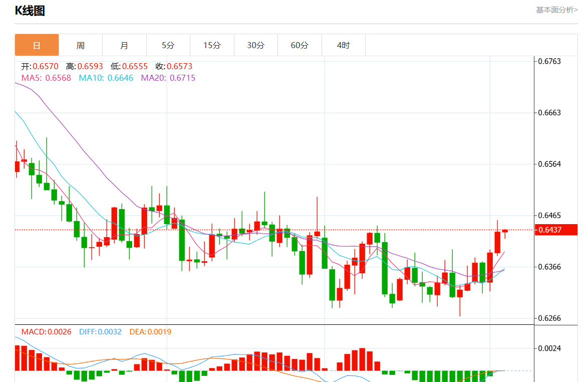 周五盘中,澳元/美元报0.6435,涨幅0.03%。