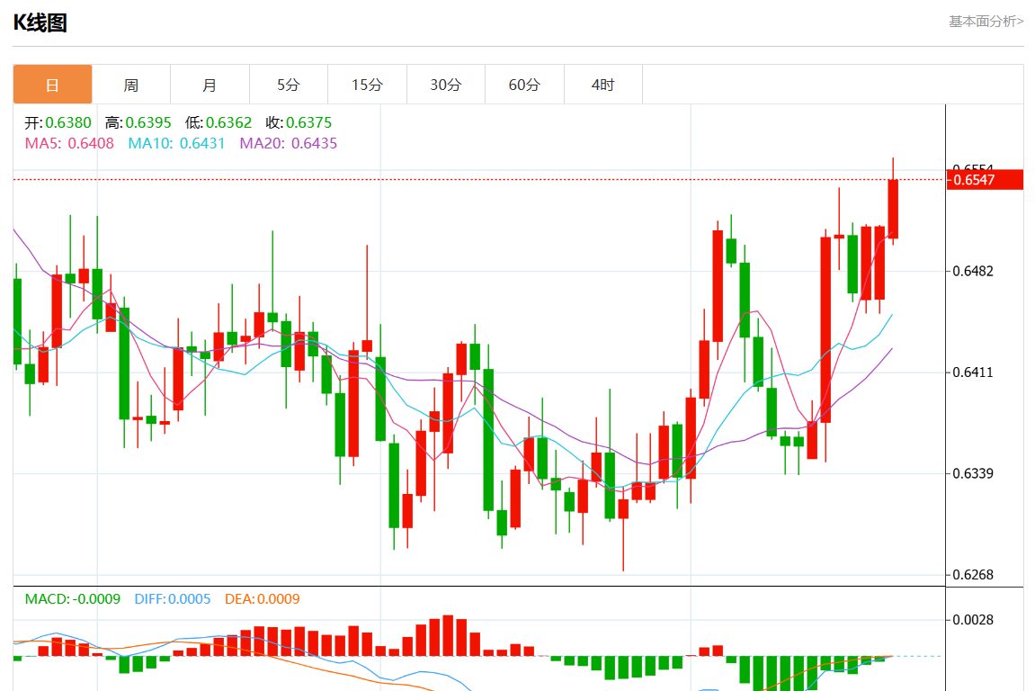 周一盘中,澳元/美元报0.6550,涨幅0.55%。