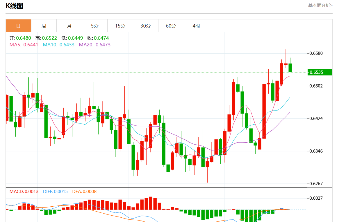 周三盘中,澳元/美元报0.6535,跌幅0.32%。