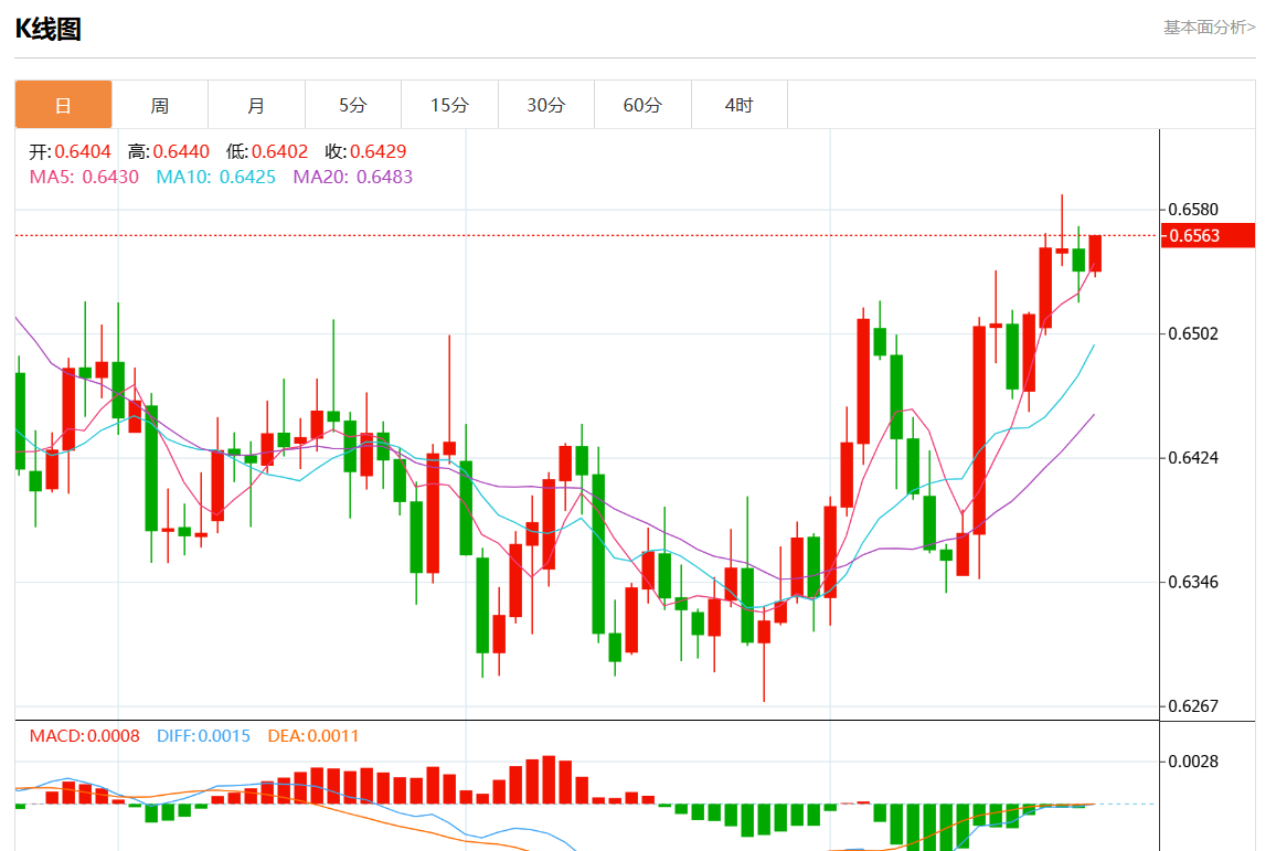 周四盘中,澳元/美元报0.6568,涨幅0.40%。