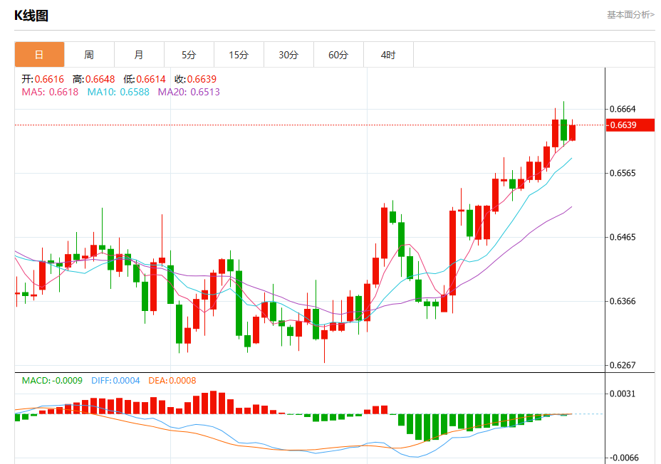 周四盘中,澳元/美元报0.6649,涨幅0.50%。