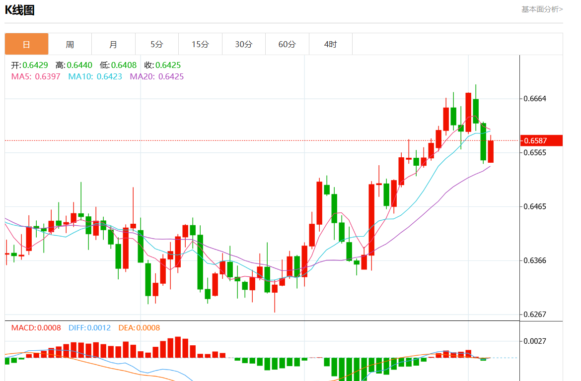 周三盘中,澳元/美元报0.6583,涨幅0.47%。