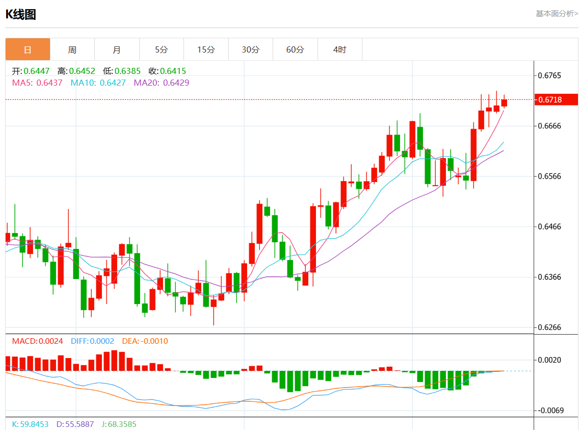 周二盘中,澳元/美元报0.6719,涨幅0.19%。
