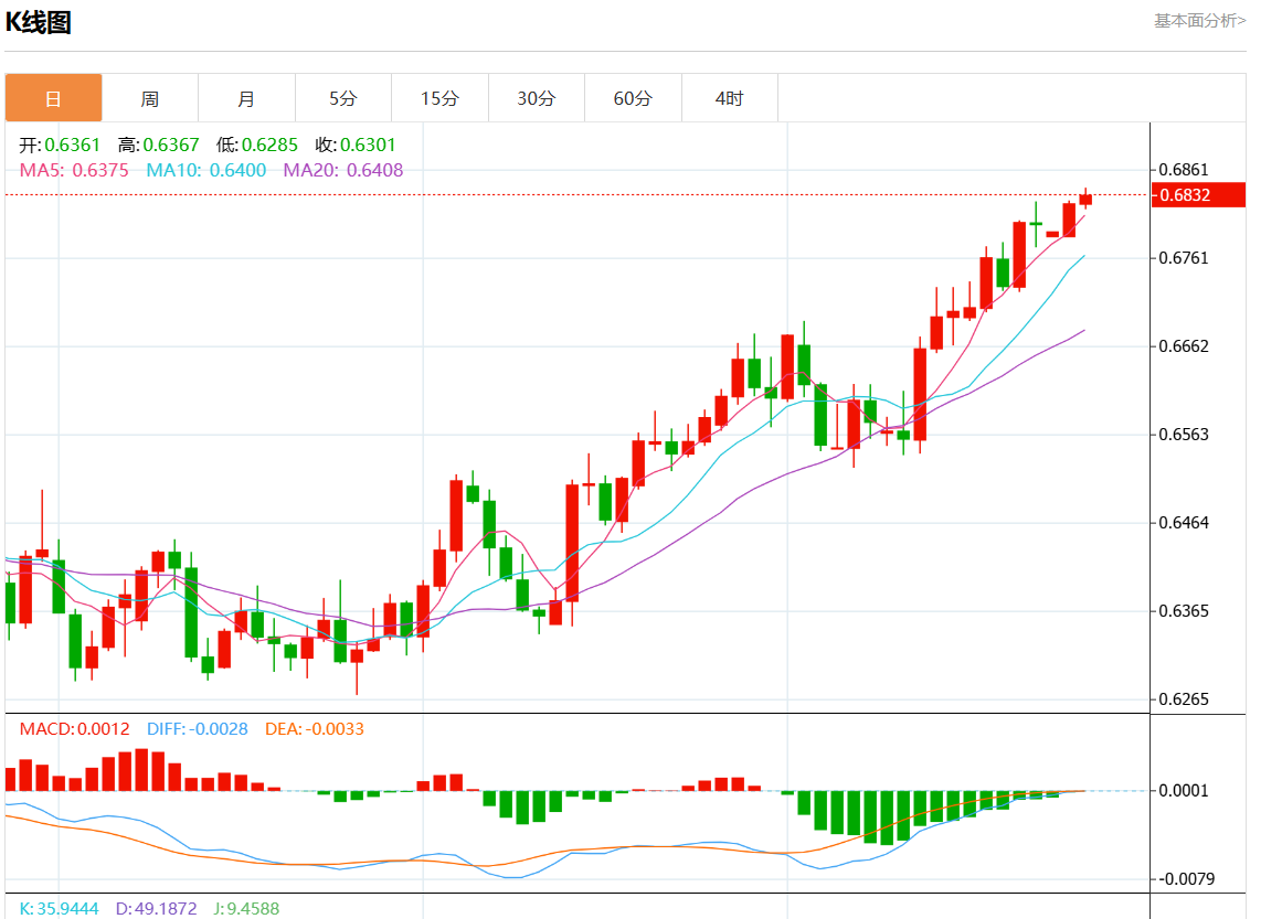 周四盘中,澳元/美元报0.6850,涨幅0.06%。