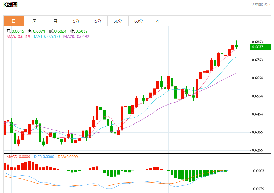 今天的预期交易区间在0.6810支撑和0.6910阻力之间