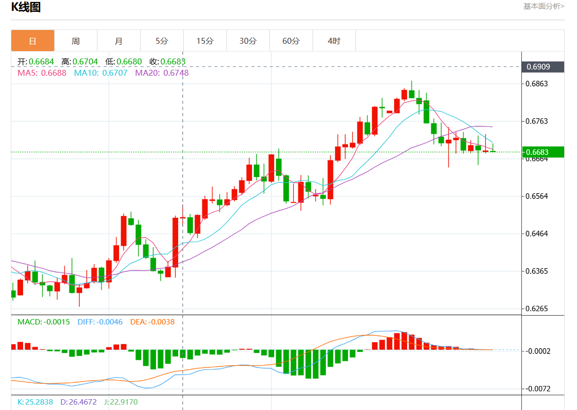 周一盘中,澳元/美元报0.6683,跌幅0.02%。