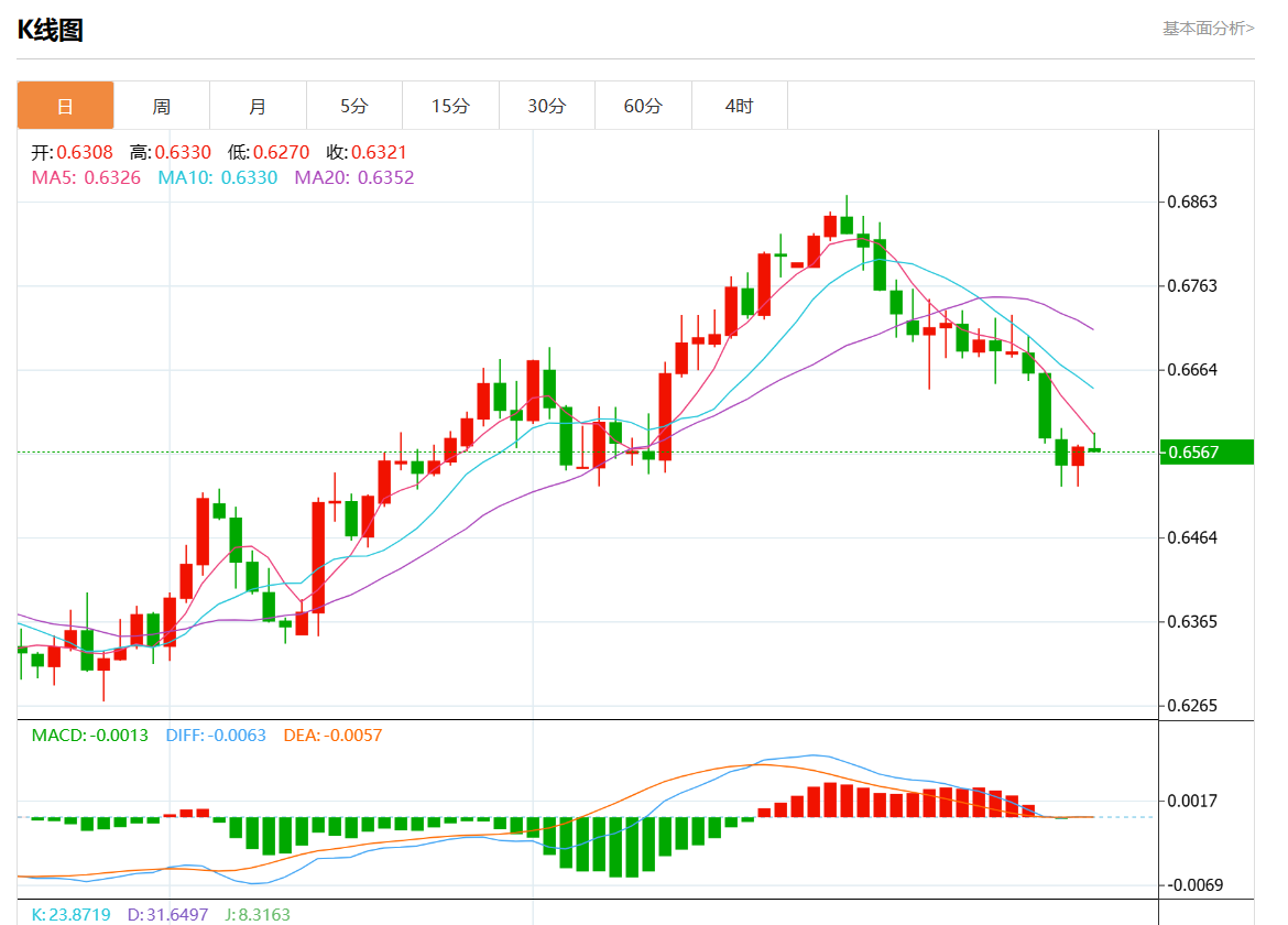 周五盘中,澳元/美元报0.6567,跌幅0.08%。