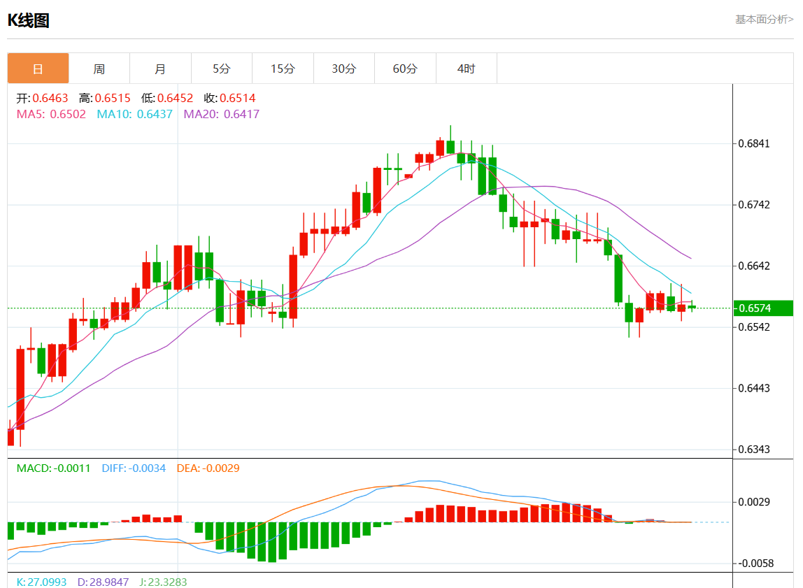 周三盘中,澳元/美元报0.6578,跌幅0.02%。