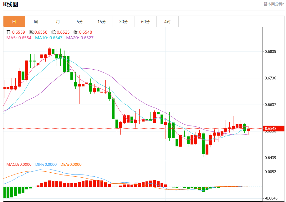 澳元上周五晚间震荡整理,最高65.81美分,报收65.65美分。今日震荡下行,截至发稿,最低至65.41美分,最高至65.67美分。