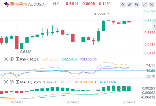 3月14日,周四欧市初盘,澳元/美元继续努力涨破0.6300关口,周四在美元小幅走强的情况下吸引了一些日内卖家。美国消费者通胀率高企助长了人们对美联储(Fed)将在短期内坚持"长期维持利率上升"路线的猜测,这使得美国国债收益率持续走高。除此之外,旷日持久的俄乌战争和伊斯拉-哈马斯冲突所引发的地缘政治风险也有助于重振避险货币美元的需求。俄罗斯总统弗拉基米尔-普京周三表示,如果美国出兵乌克兰,将被视为冲突的重大升级,莫斯科已做好核战争的准备。美国新闻网站Politico的一篇报道指出,美国高级官员已告诉以色列同行,拜登政府将支持打击拉法及其地下的哈马斯高价值目标。