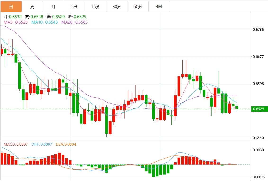 周三亚盘,澳元/美元下跌,交投于0.6525附近,日内下跌0.11%。日线相对强弱指标显示,若指标仍低于50,看跌动能可能会增强。