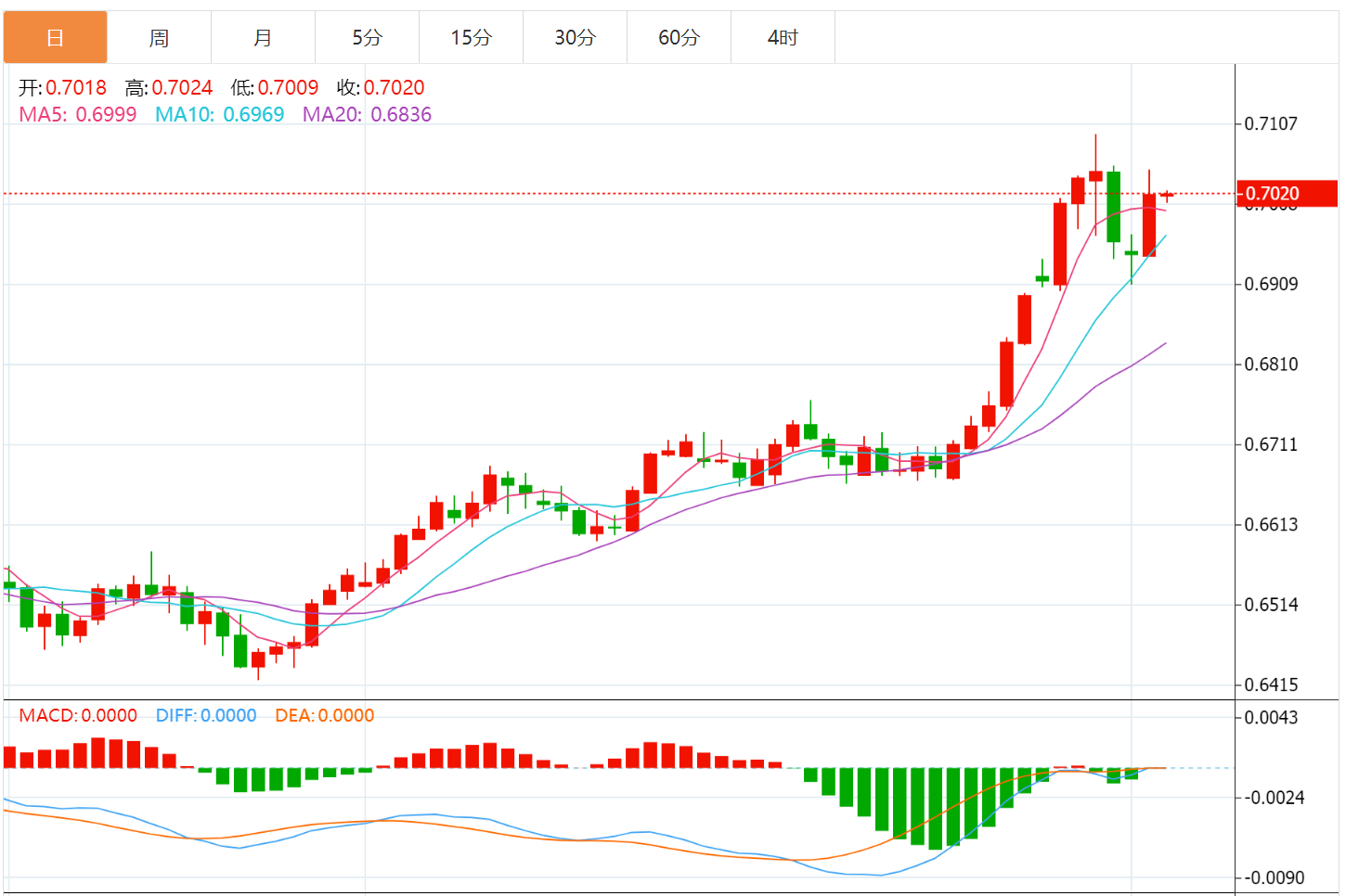 澳元兑美元今日汇率最高0.6495 ,最低0.6494 ,涨跌-0.0017,涨跌幅-0.26% 。