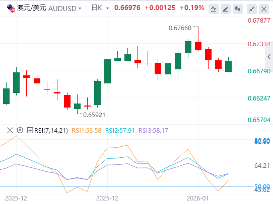 澳元/美元周一交易约0.6700。日线图分析显示该货币对试图反弹,朝上升通道方向走,显示出新一轮多头偏向。14天相对强弱指数(RSI)位于58.33,仍位于中线以上,支撑上行动能。