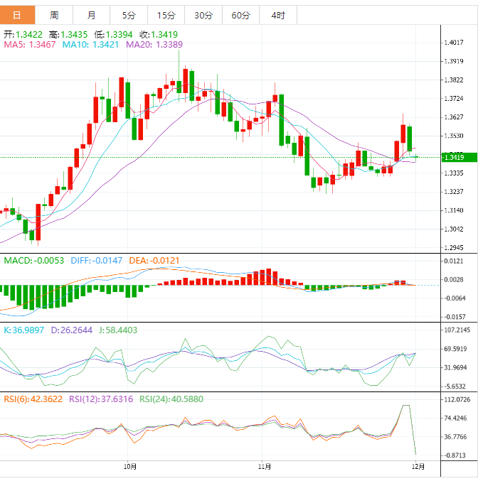 周四盘中,美元兑加元下跌至1.3421,跌幅0.02%。