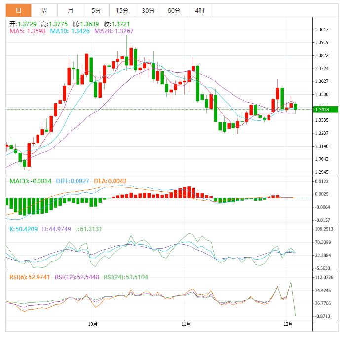 周一盘中,美元兑加元下跌至1.3420,跌幅0.33%。