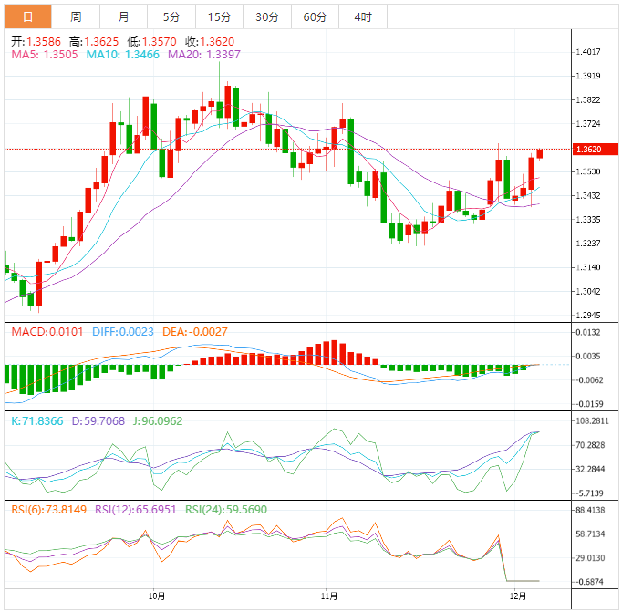 周二盘中,美元兑加元上涨至1.3623,涨幅0.25%。