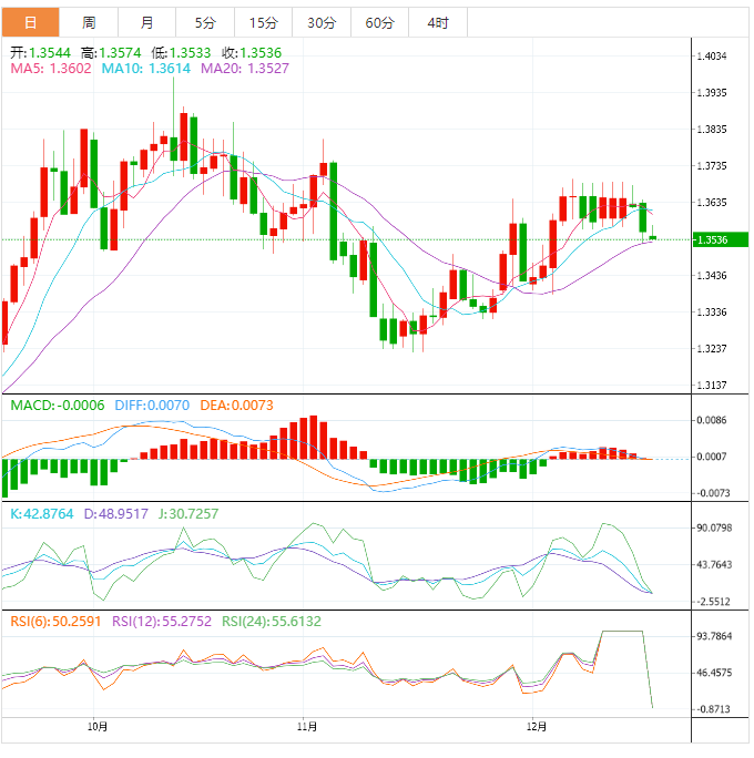 周三盘中,美元兑加元下跌至1.3537,跌幅0.07%。