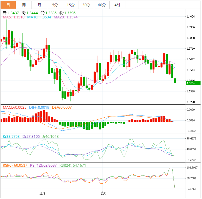 周一盘中,美元兑加元下跌至1.3397,跌幅0.36%。