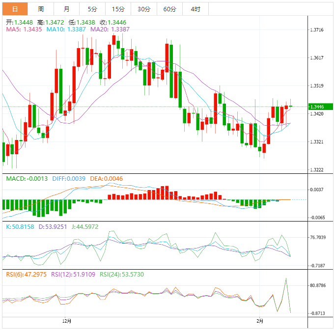 周五盘中,美元兑加元下跌至1.3448,跌幅0.02%。