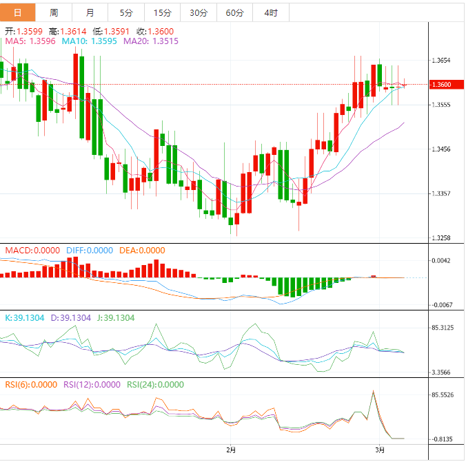美元兑加元在1.3600附近温和上涨,在亚洲市场周一早上,空头在连续三天下跌后喘息。