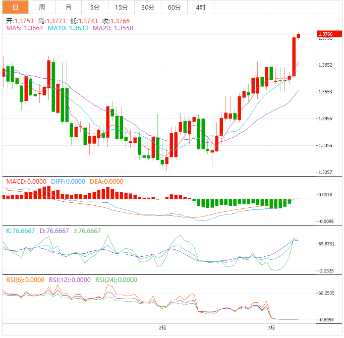 10周期指数移动平均线(EMA)在1.3634的上涨表明上行势头非常强劲。
