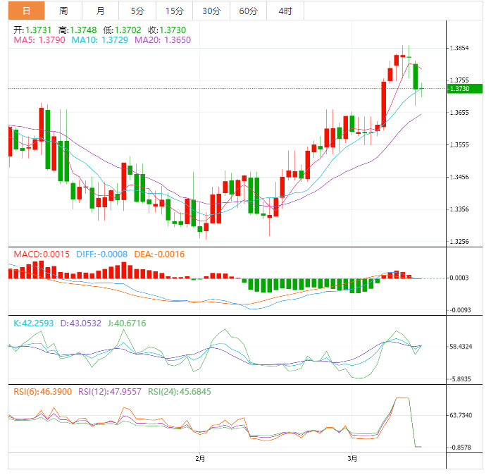 周二盘中,美元兑加元上涨至1.3732,涨幅0.01%。