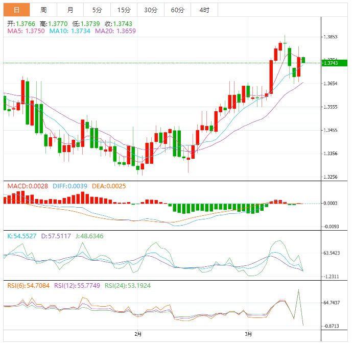 周四盘中,美元兑加元下跌至1.3745,跌幅0.17%。
