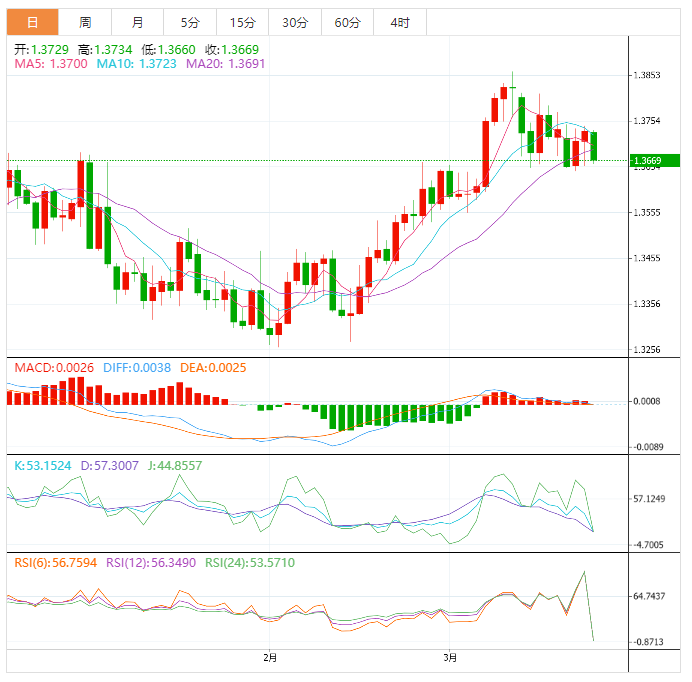 周四盘中,美元兑加元下跌至1.3672,跌幅0.44%。
