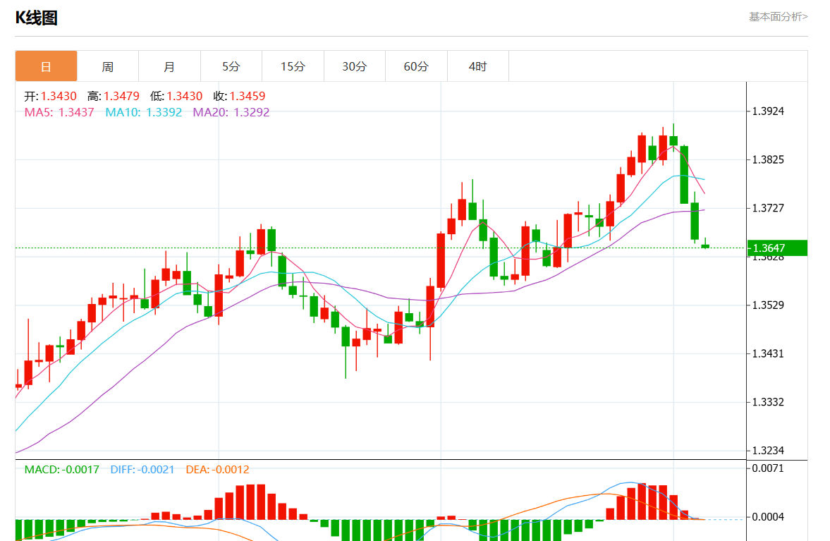 周一盘中,美元/加元报1.3651,跌幅0.10%。