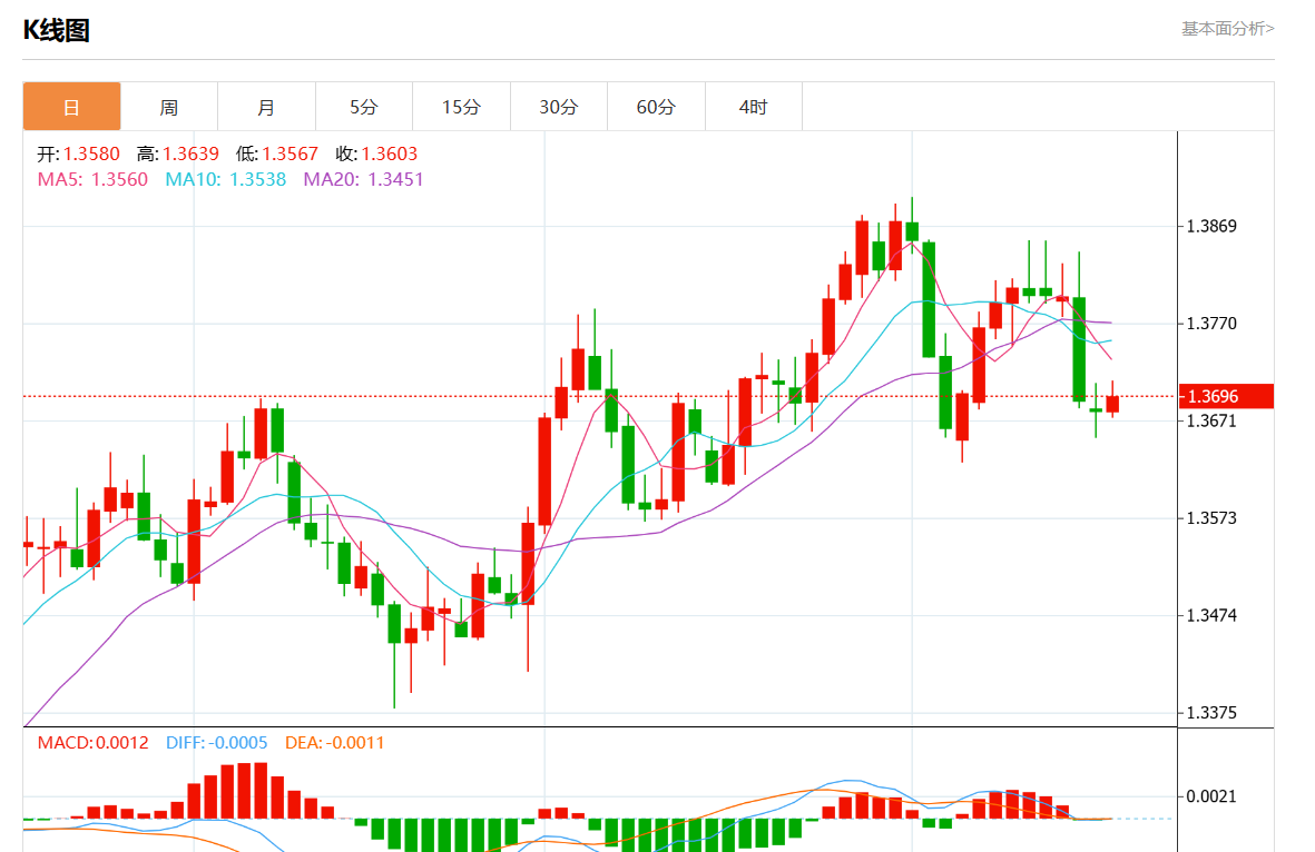 周四盘中,美元/加元报1.3696,涨幅0.11%。