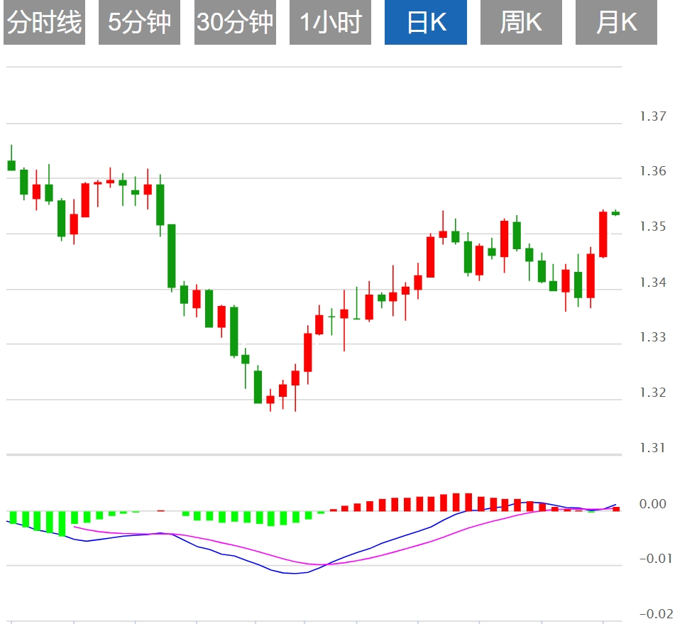 从技术上来看,美元/加元重拾升势,4小时图显示美元/加元处在100期指数移动均线上方。 另外相对强弱指标(RSI)位于50.0中线上方,暗示美元/加元将进一步上行。